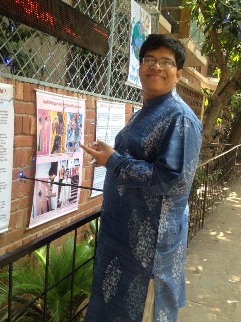Aadil Hoque in front of a poster of his work